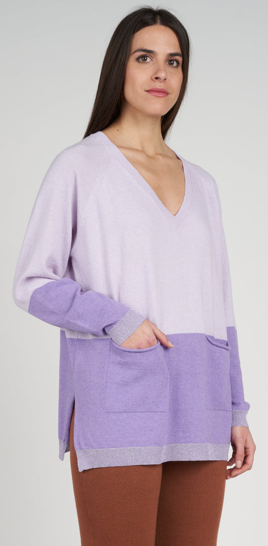 Maglia V bicolor lurex dettaglio 2 tasche