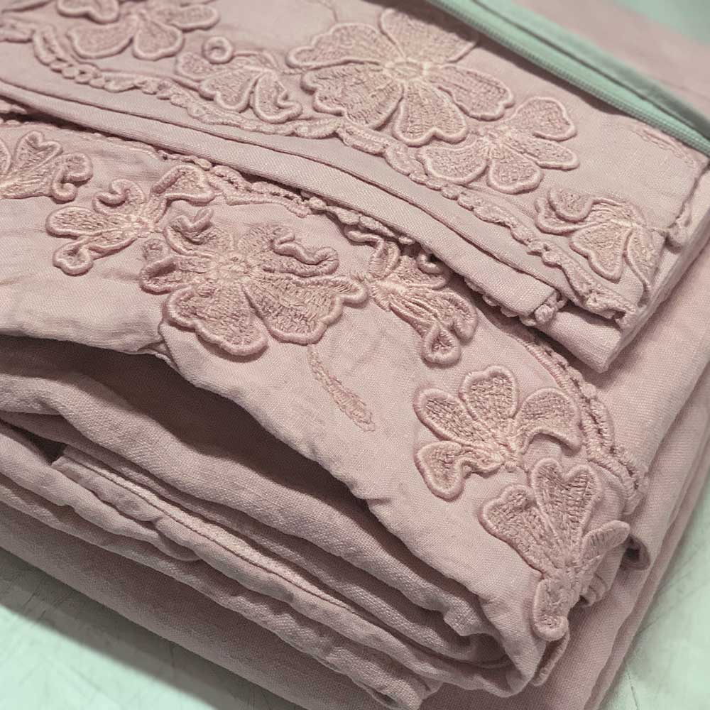 The delicate floral embroidery in relief that embellishes the frame of the tablecloth is expertly crafted by expert craftsmen. Each flower and leaf has been carefully crafted to create a refined and harmonious design. This floral touch adds a sophisticated elegance to the tablecloth, making every meal a special occasion.
